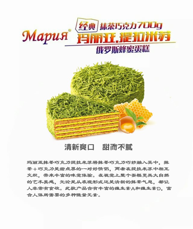 玛丽亚提拉米苏,采用俄罗斯的纯天然蜂蜜和动物性乳脂黄油为主要原料,天然蜂蜜独有的芳香和纯动物性黄